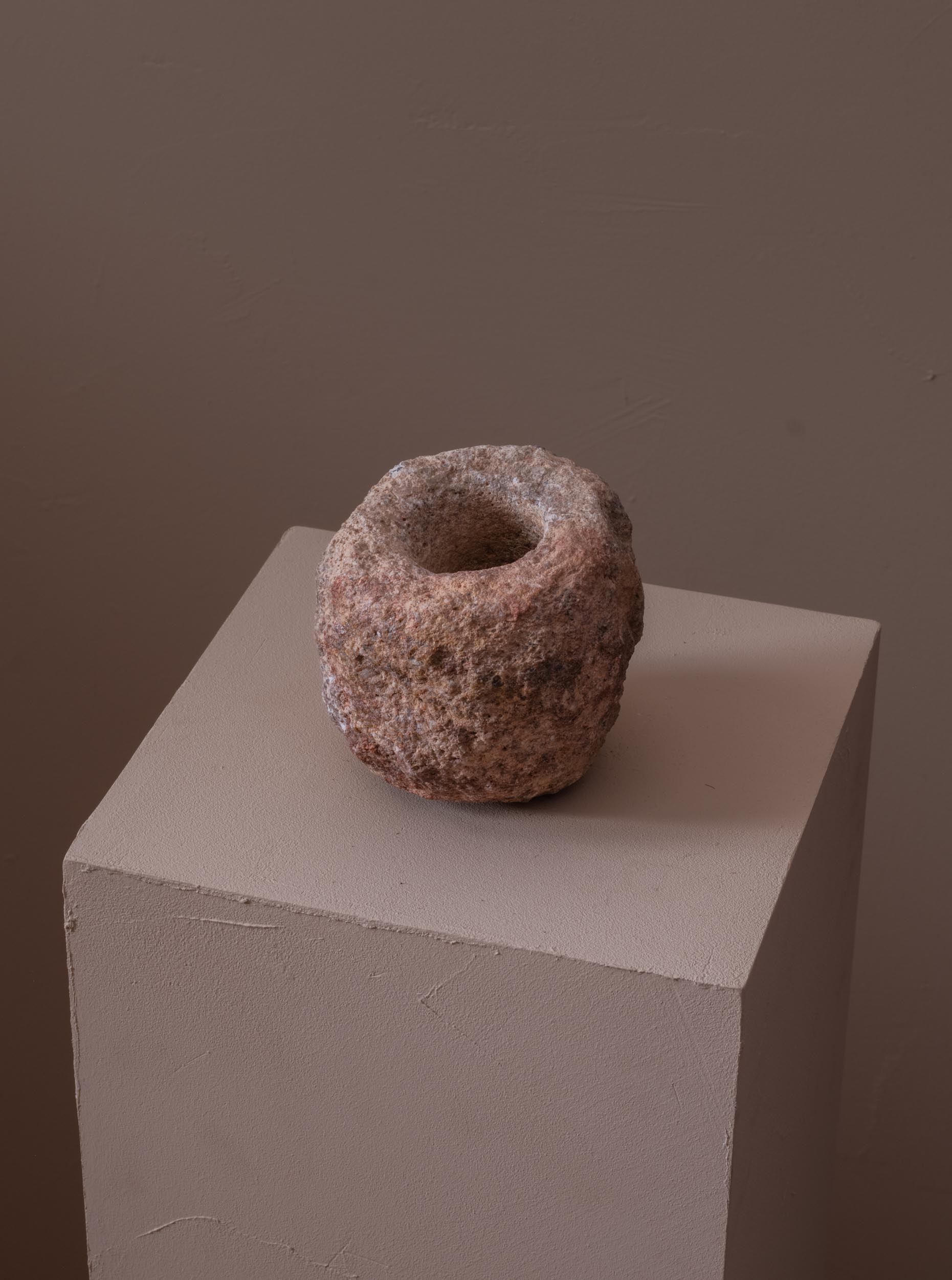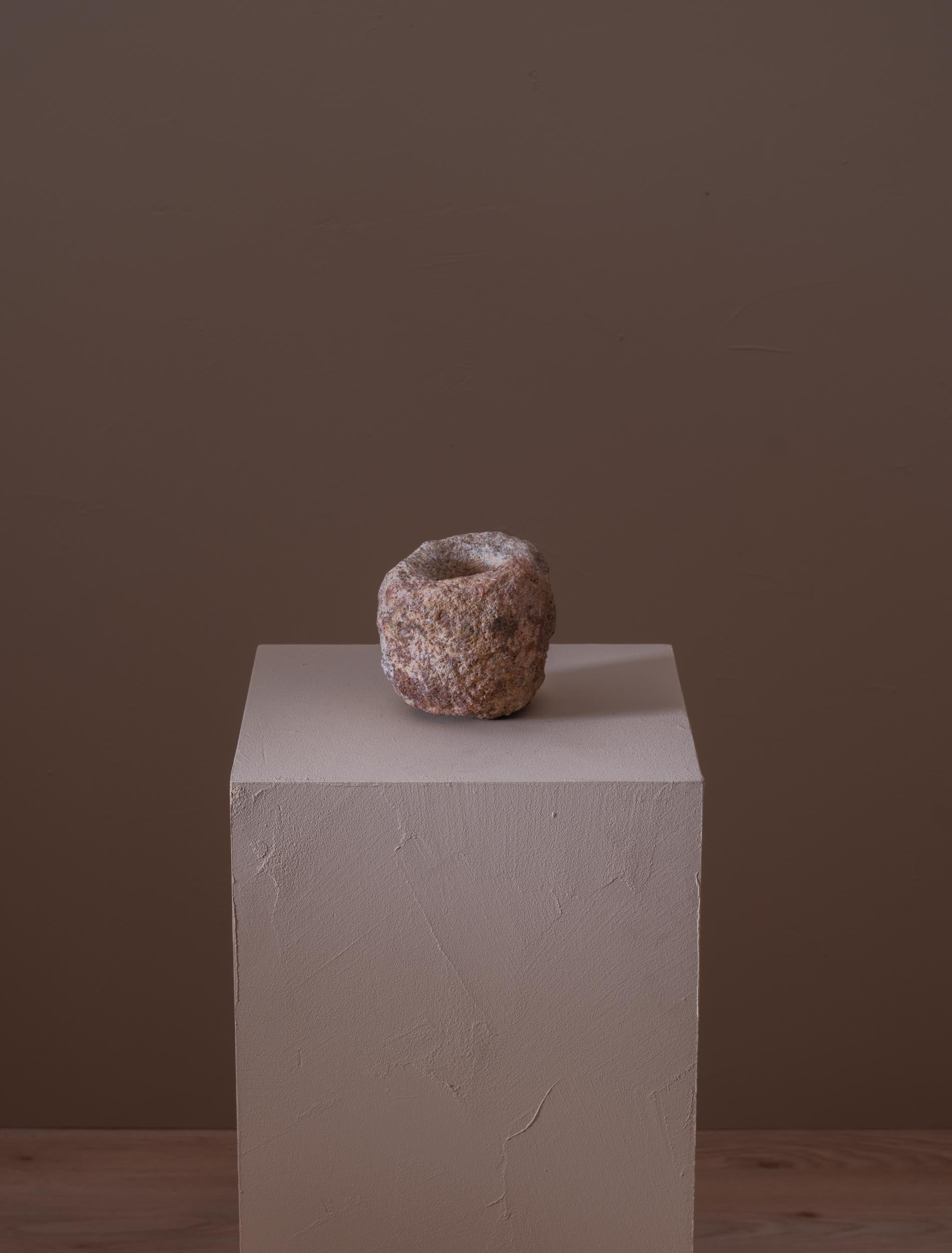 The hollowed out interior of the coarse rock provides a recess in which to hold and display objects.