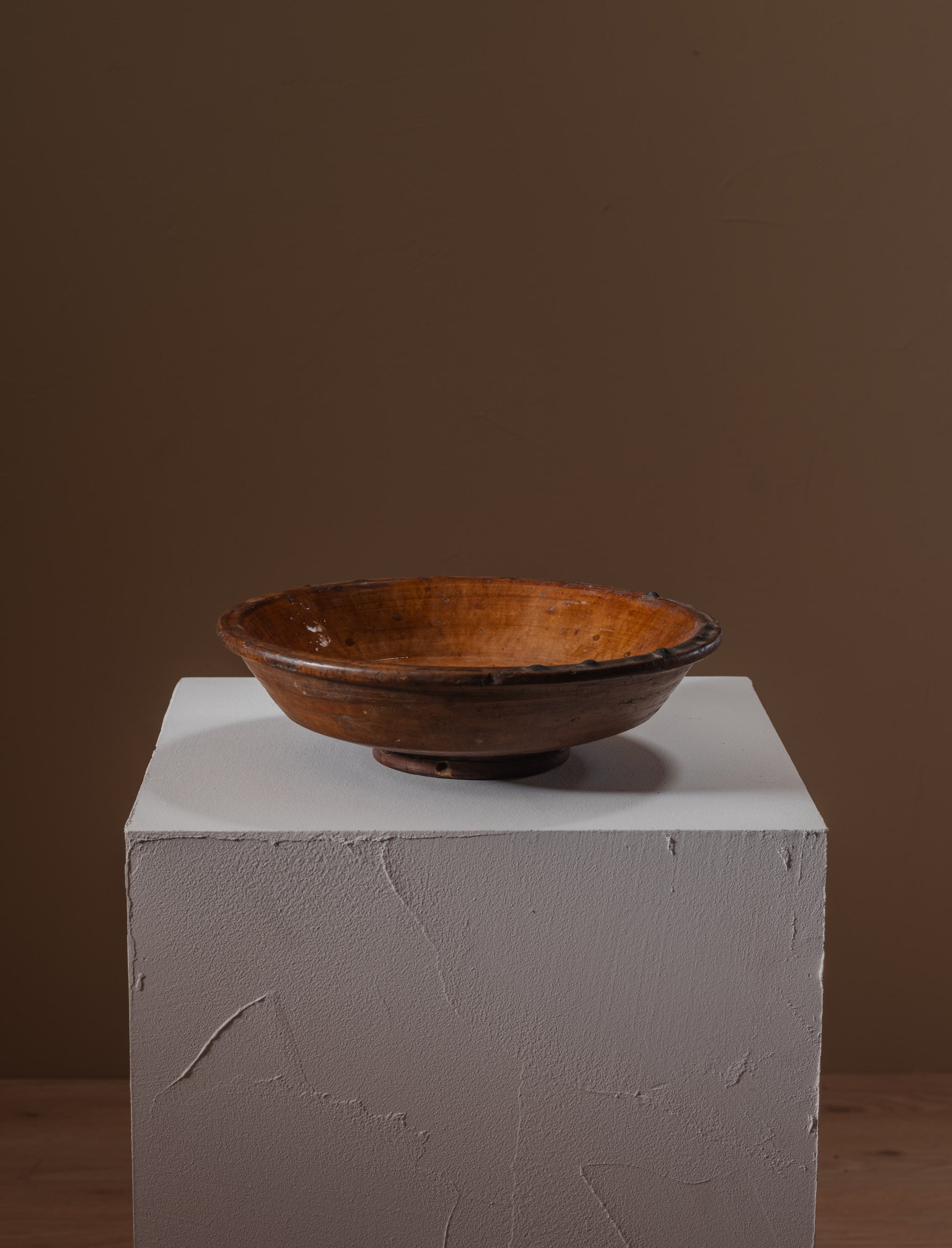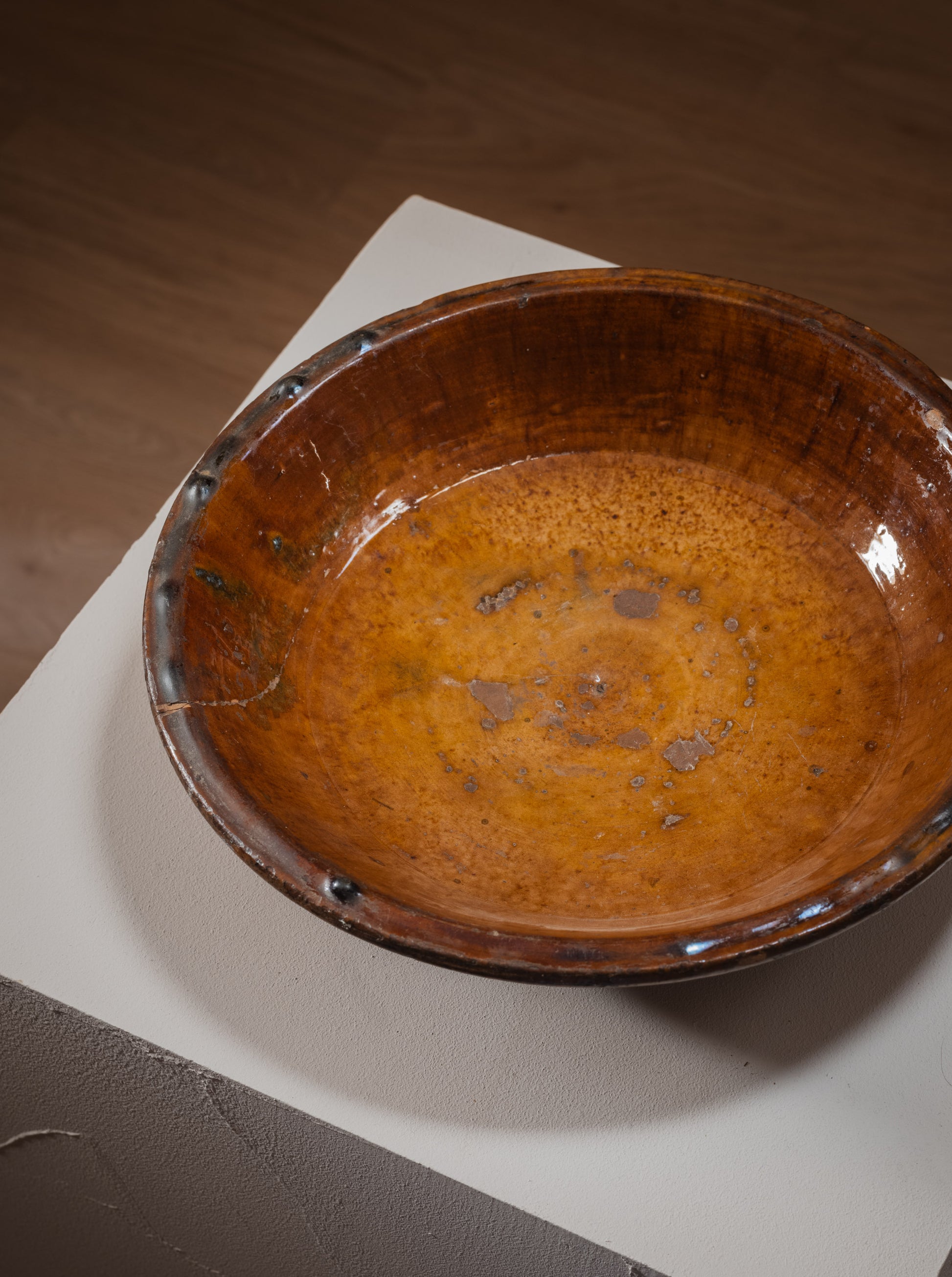This high walled ceramic bowl from the Draa valley of Morocco has a distinctive orange/brown glaze characteristic of the region.
