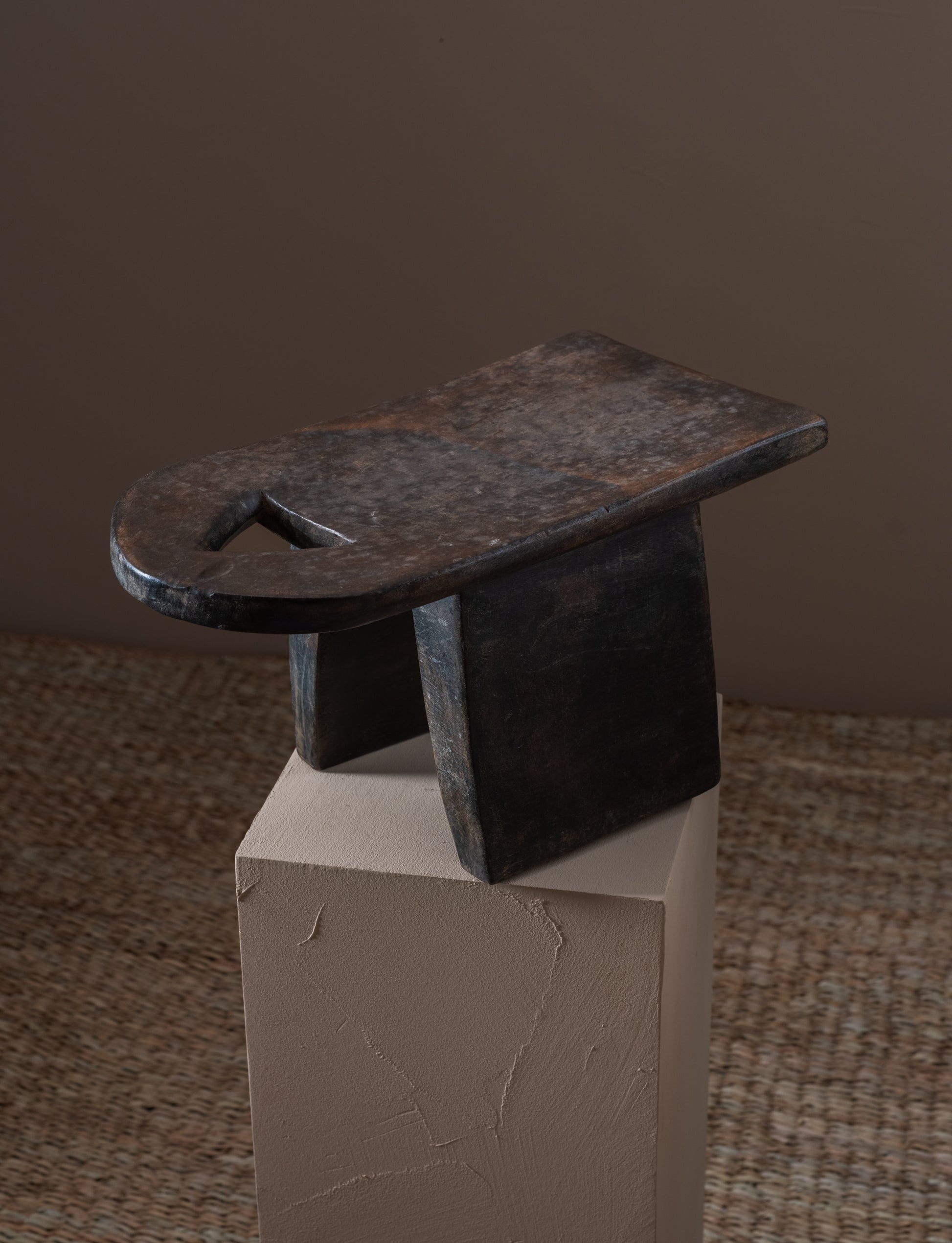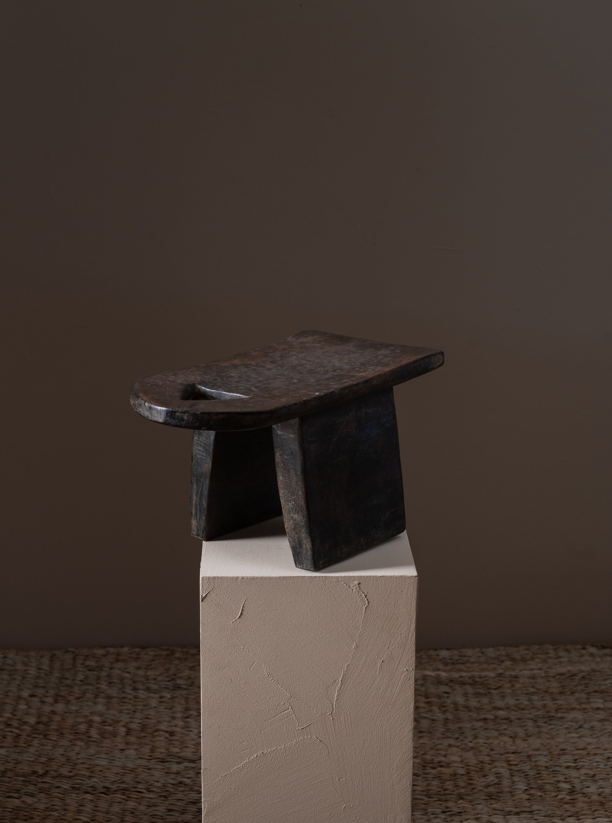 Hand carved from a single piece of wood, this is a sturdy accent piece with a flat top and triangular cutout handle.