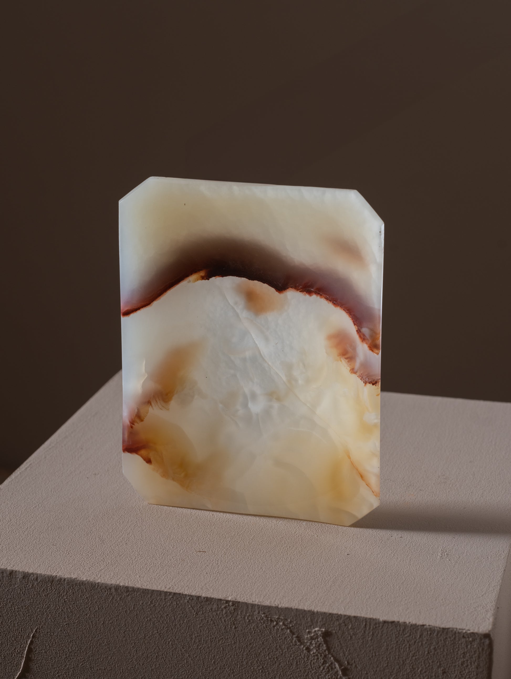 Patched with warm milky tones this beautiful agate plate has a bold crimson crystal band cutting across its midsection. In the centre, where the agate is at its thinnest, the silica has subtle yet ethereal semi-transparent quality.
