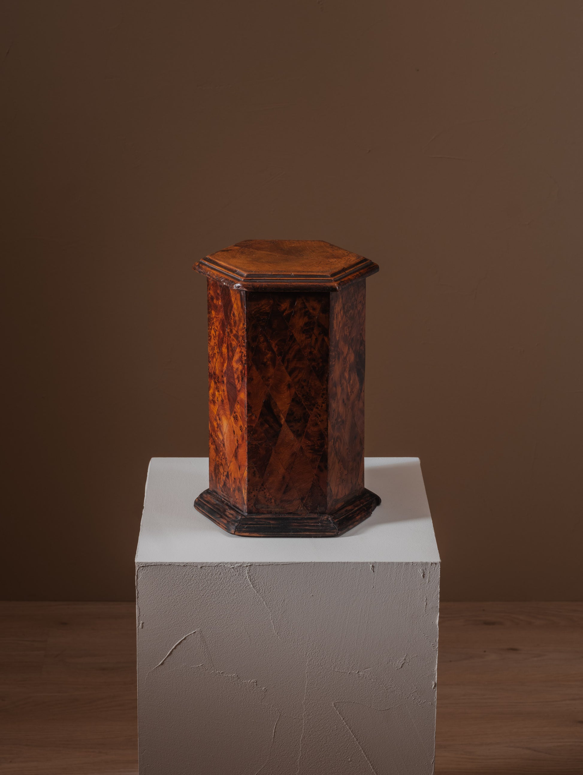 Handmade hexagonal plinth with diamond shaped thuya burl wood veneer.
