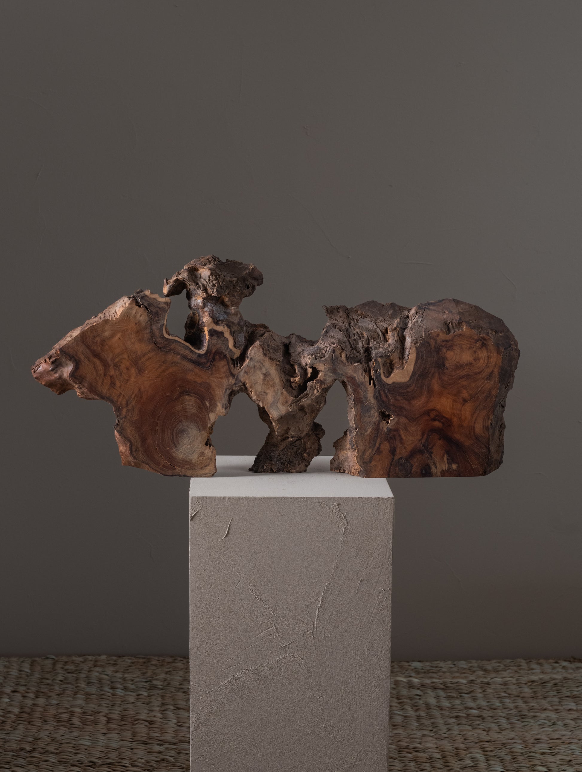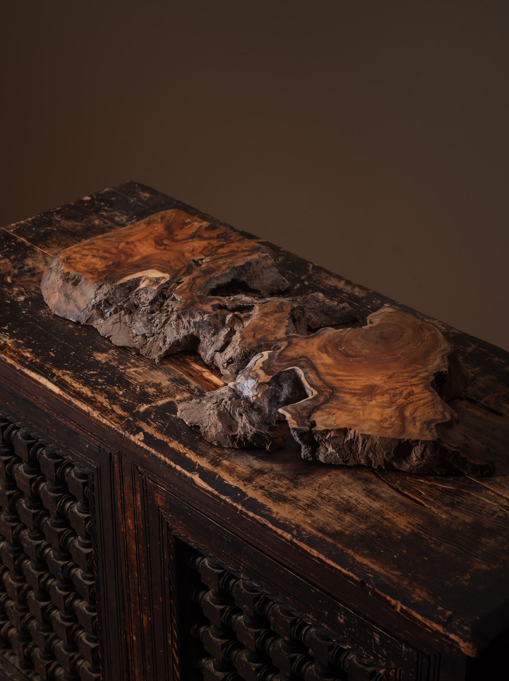 Large section of decorative thuya burl wood hewn out of the gnarled growths that give this wood its unique speckled grain.