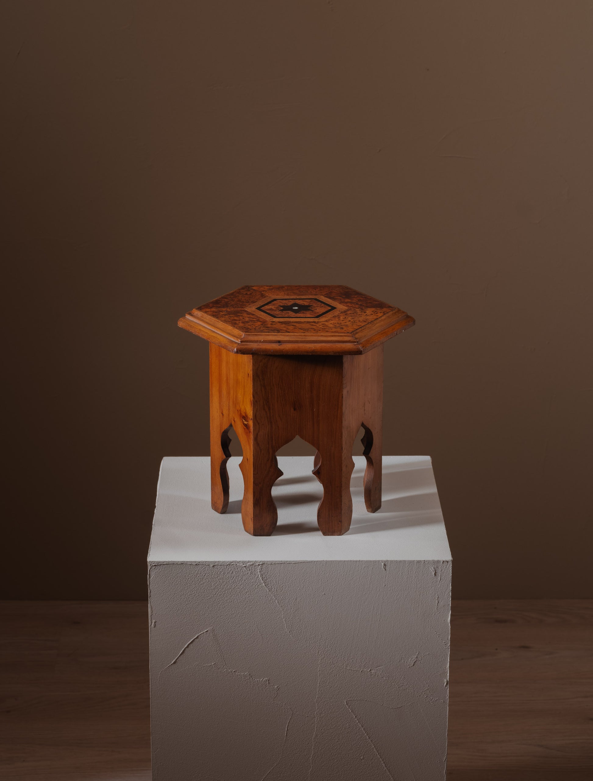 This is a lovely example of Moroccan marquetry from the 70's, mastered by artisans in cities like Essaouira. It features many hallmarks of Islamic design, including the distinctive hexagonal tabletop shape and the pointed arch cutouts in the leg panels.