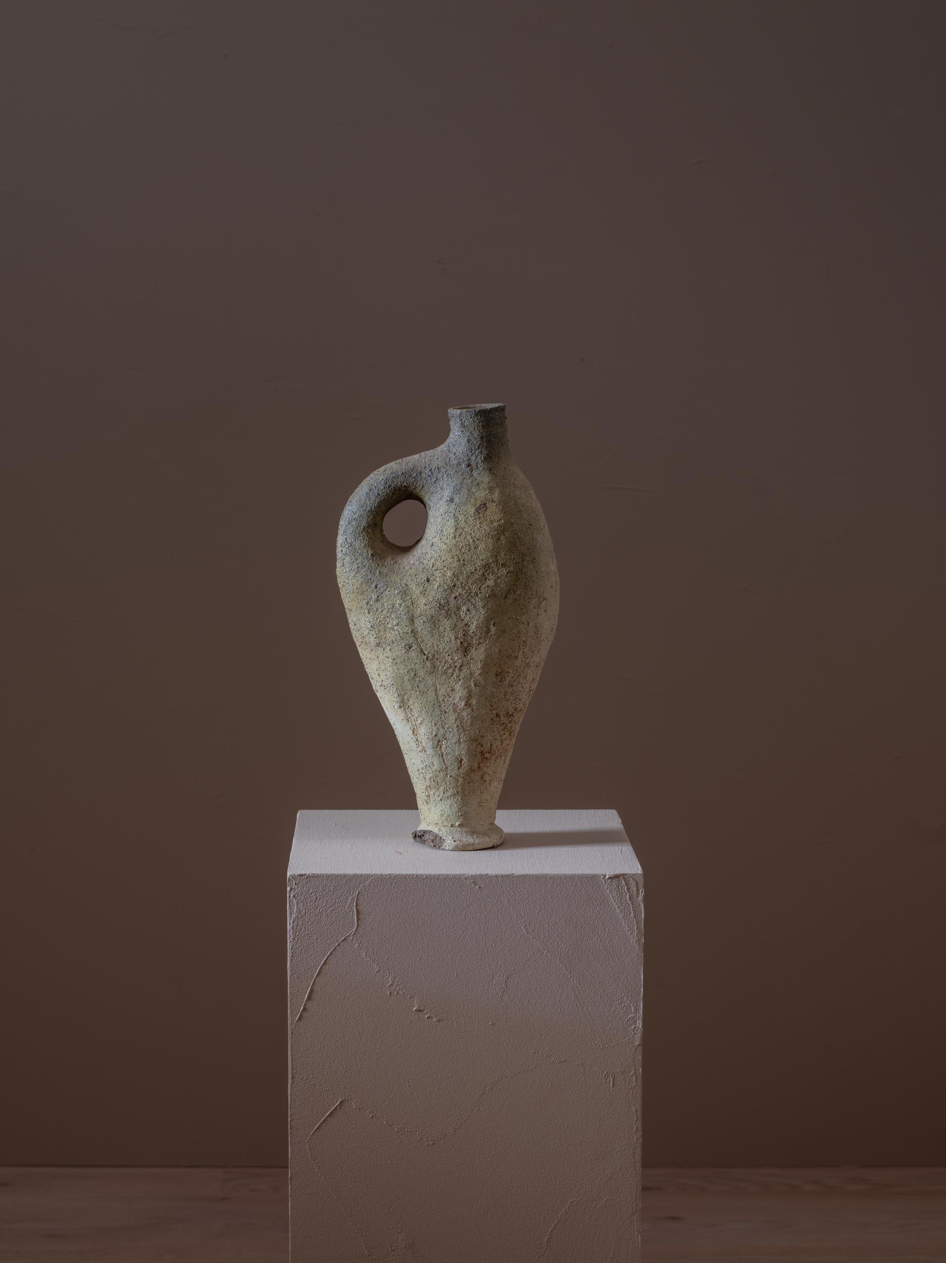 This classic amphora shape harkens back to ancient Mediterranean pottery. Its historic aspect is accentuated by the patina and texture it has developed over the years.